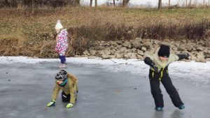 Zamrzly nám kaluže i celý mokřad a tak jsme to šli zkontrolovat.Děti si potrénovaly rovnováhu a  pohyb na ledě.  Byla to pěkná legrace, i když se někdy žuchlo na zadek.  Pozor, jedu!!!